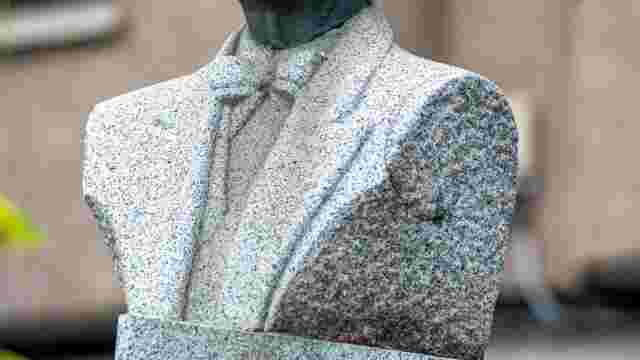 Escultura de Francisco Mora de piedra caliza que simboliza la fragilidad de la paz