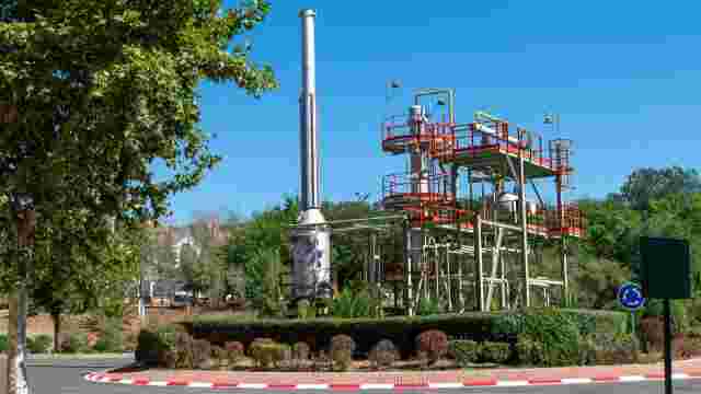Estructura homenaje a los impulsores de la refinería inscrita en una rotonda