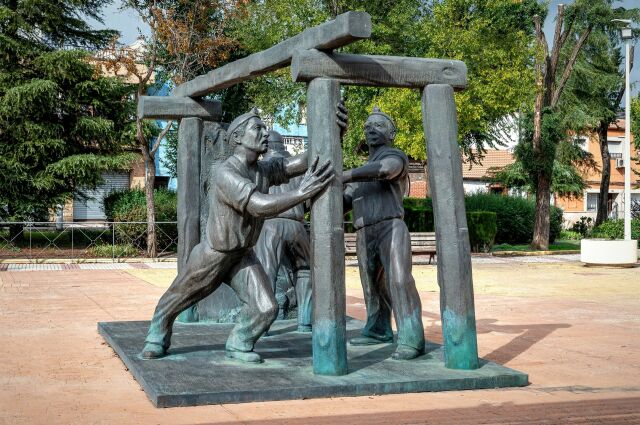 Grupo escultórico de piedra que representa a los caídos en el trabajo. Ubicado ante la iglesia de Santa Bárbara del Poblado